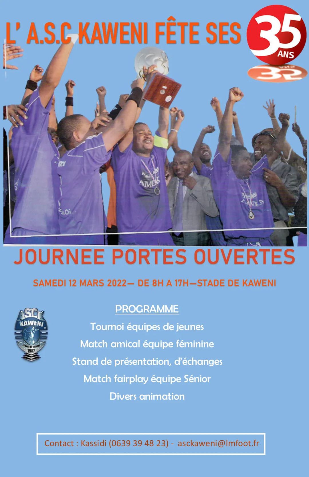 Journée portes ouvertes Par M-Karakara 27/02/2022 Culturels 708 vues totales, 0 aujourd'hui Accueil Culturels Journée portes ouvertes Dans le cadre du 35 ème anniversaire de l’ASC Kaweni, L’ASCKawéni organise une journée portes ouvertes le 12 Mars 2022 au stade de Kaweni.